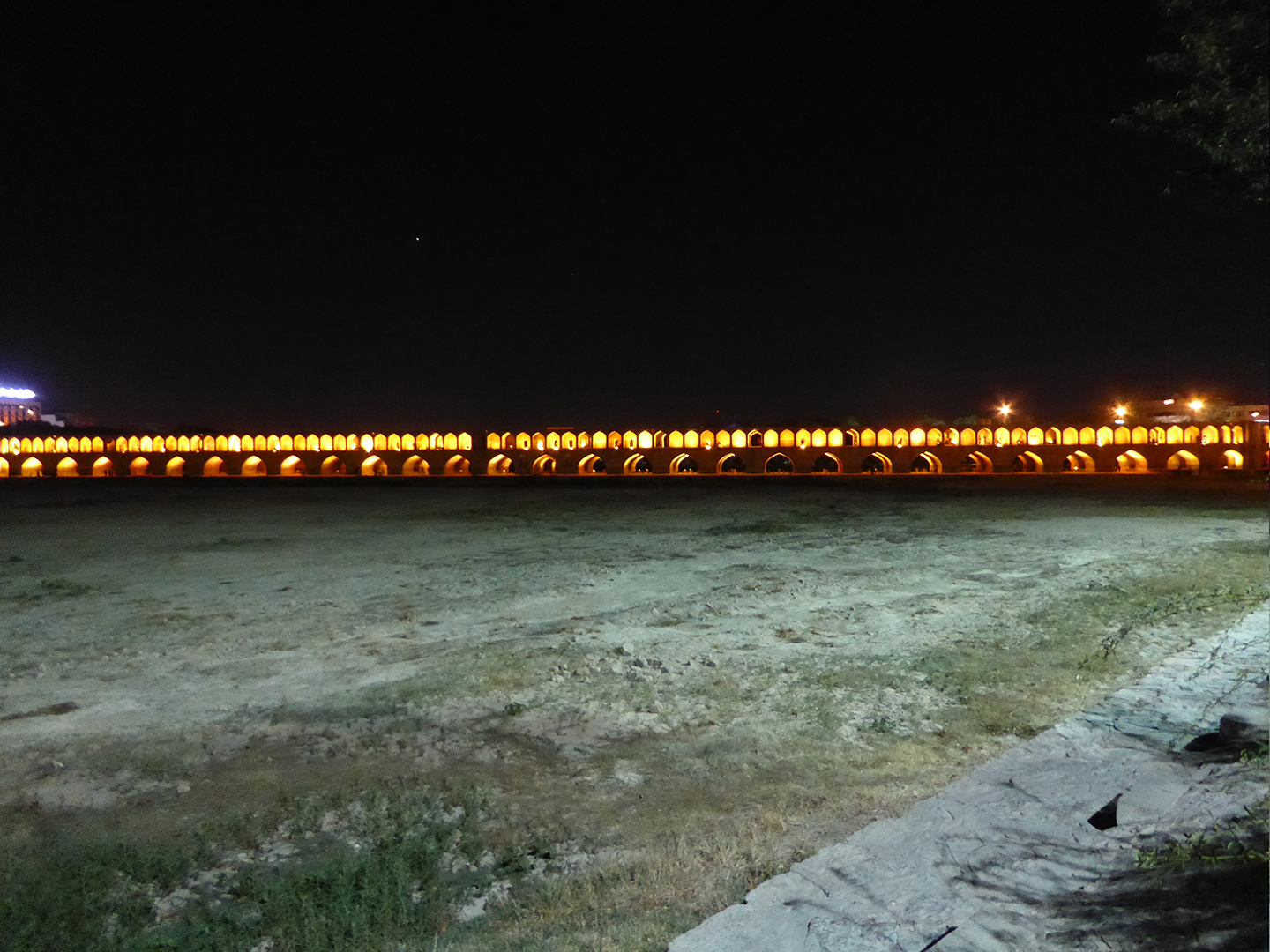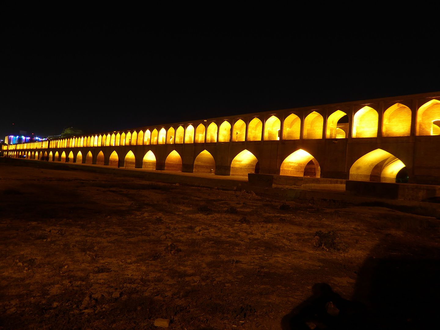 Im Anschluss gingen wir zu Fuß zur 33-Bogen-Brücke, (Si-o-se Pol), ein Treffpunkt vieler Bewohner Isfahans. Am Abend ist jede der 11 Brücken über den zurzeit ausgetrockneten Fluss bunt beleuchtet. Zusammen mit den geschmückten Straßenlaternen sieht es in den Städten so aus wie bei uns nur zu Weihnachten. Es herrscht bei den milden Temperaturen eine entspannte und angenehme Atmosphäre. Gegen 22:00 Uhr machten wir uns auf den Heimweg, während die Iraner noch in großer Zahl mit Kindern auf der Straße waren. Wir vermuten, dass die heiße Jahreszeit dazu führt, dass man die kühleren Abendstunden im Freien genießen möchte. Auf den gepflegten Grünflächen am Imam-Platz und am begrünten Flussufer hatten sich viele Familien zum Picknick eingefunden.